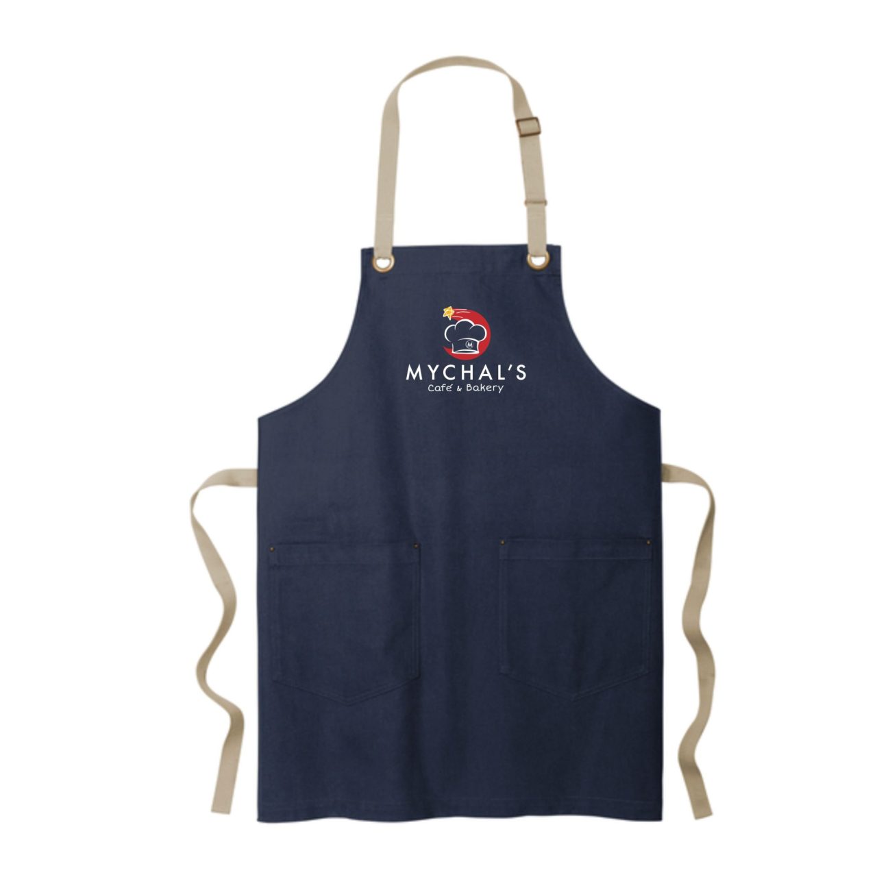 - Navy colored apron with white embroidered Mychal’s Café & Bakery logo